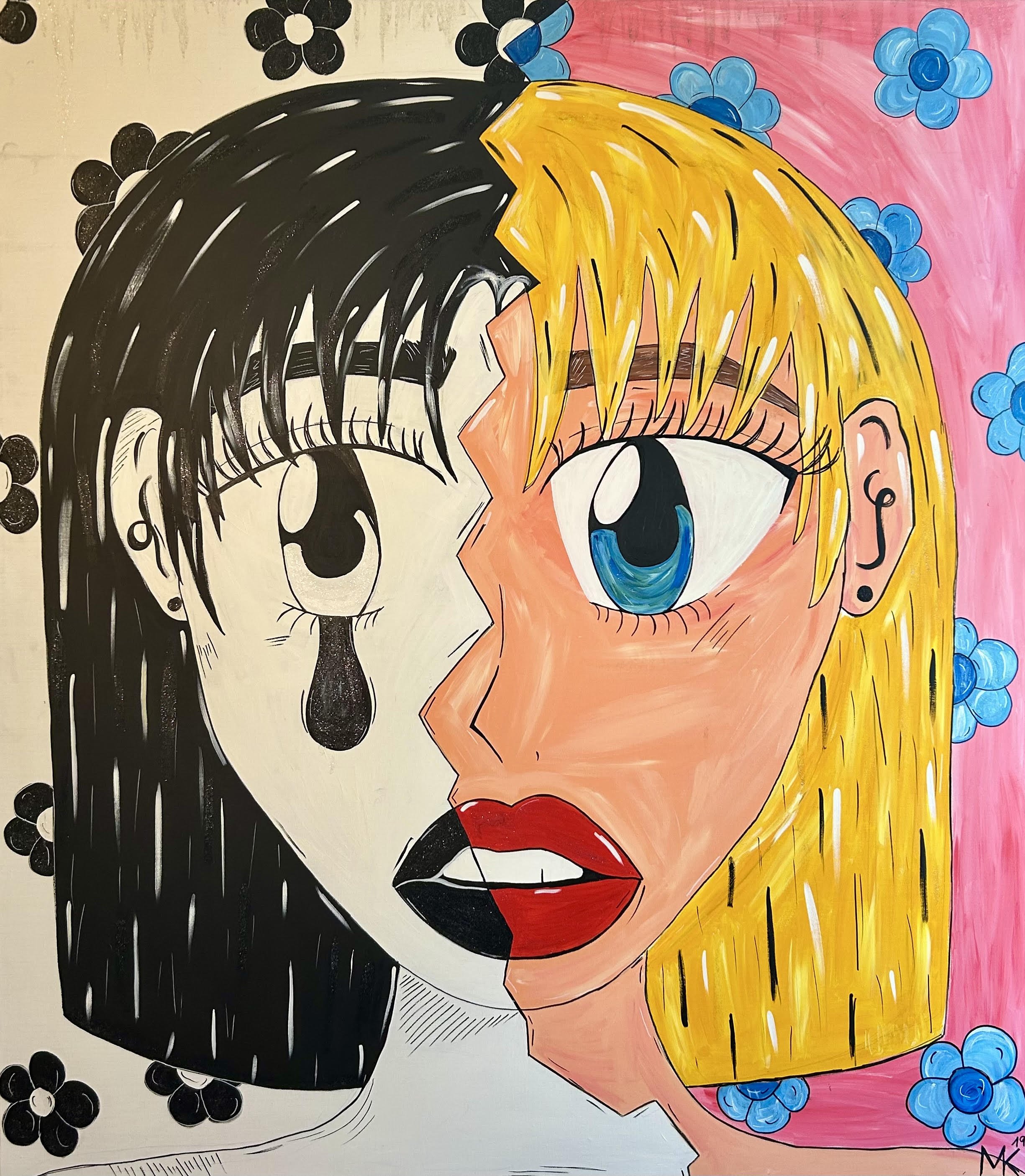 Two halves, one face, an inner conflict. The left side: black and white, tearful, an expression of deep sadness. The right side: colorful, alert, loud, but the gaze remains uncertain, the mouth trembles with restraint. This work shows the contrast between inner pain and outer façade. Two identities, two moods, and yet united in one person. A look into the inner turmoil that we often hide behind a smile.